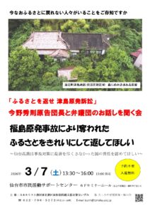 東京電力福島第一原発事故からまもなく15年をむかえようとしています。しかしながら今なおふるさとに帰れない住民が多く存在することをご存知でしょうか?福島県浪江町津島地区は今も98.4%のエリアが避難区域とされており、住民のほとんどは異郷での避難生活を余儀なくされています。自宅や田畑は荒れ放題になり、帰りたいと待ち続けるも亡くなる方も少なくありません。この間、住民不在の「復興」事業が進められる一方で、2015年9月、ふるさとに戻りたいと願う津島地区住民(約半数)が原告となり、国や東京電力の責任を問い、あわせて、ふるさとを返せ、という原状回復請求を提起しました。現在は二審、仙台高裁で審理が行われ、3/9には結審、まもなく判決が出される見込みです。津島の現状やふるさとへの想い、訴訟の見通しなどをお二人からお聞きします。みなさまのご来場、ご視聴をお待ちしています。(オンライン配信有り)