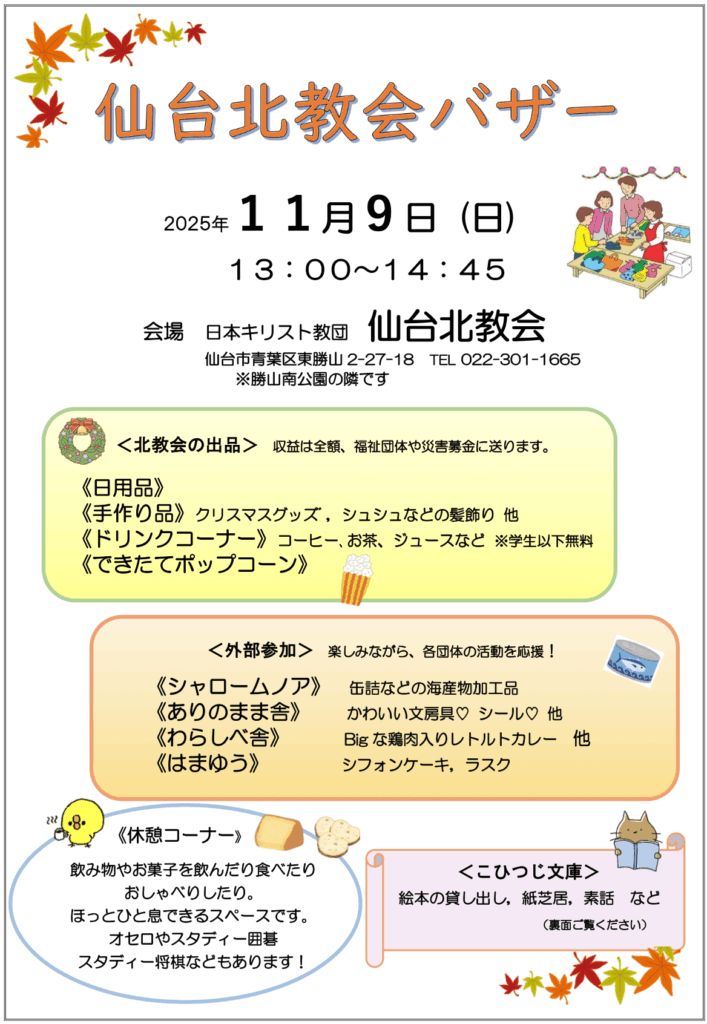 「こひつじ文庫」(絵本貸出)、チャリティー・バザー、パイプオルガン・コンサートなどを開催。地域の福祉団体等への会場貸出も行なっています(規定有/要相談)。